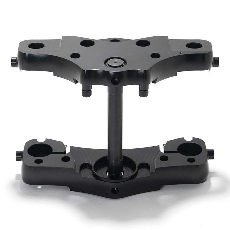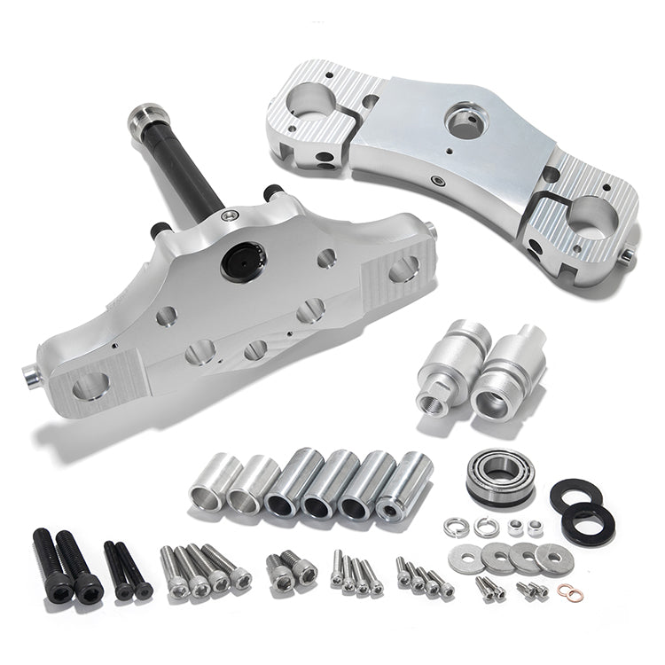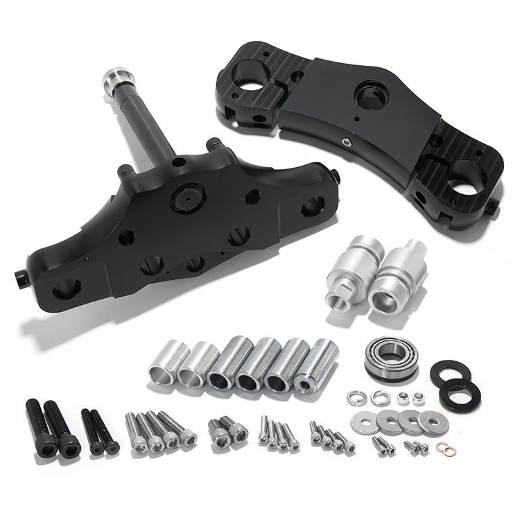 - The kit includes aluminum triple trees, steering stem, fork tube extension, fork stops, travel limiters, and everything else necessary for installation.